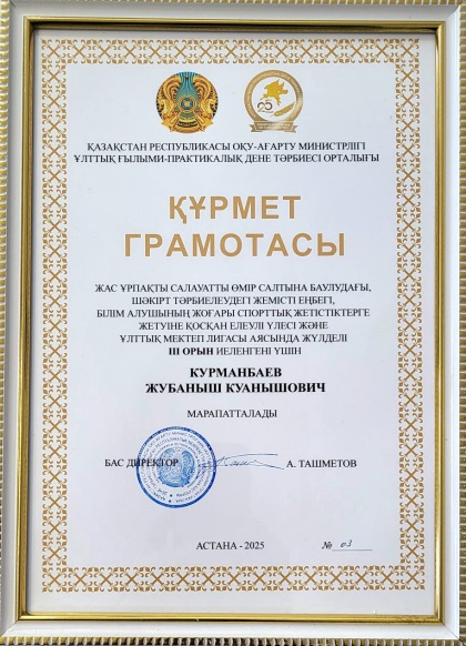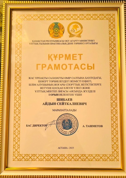 2025 жыл 30 қыркүйек күні «Ақтөбе-Дарын» өңірлік ғылыми-тәжірибелік қосымша білім беру орталығы 2024-2025 оқу жылында өткізілген Ұлттық мектеп лигасын қорытындылау мақсатында салтанатты жиын ұйымдастырды. Жас ұрпақты салауатты өмір салтына баулудағы, шәкірт тәрбиелеудегі жемісті де адал еңбегі, білім алушының жоғары спорттық жетістіктерге жетуде қосқан елеулі үлесі мен Ұлттық мектеп лигасы аясында жүлделі орынға ие болған Жубаныш Куанышович Курманбаев пен Айдын Сейткалиевич Шибаев ҚАЗАҚСТАН РЕСПУБЛИКАСЫ ОҚУ-АҒАРТУ МИНИСТРЛІГІНІҢ ҚҰРМЕТ ГРАМОТАСЫМЕН марапатталды. Ұстаздарымызды шын жүректен құттықтап, алдағы уақытта спорт саласында алар асуларыңыз бен шығар биіктеріңіз көп болсын деп тілейміз!