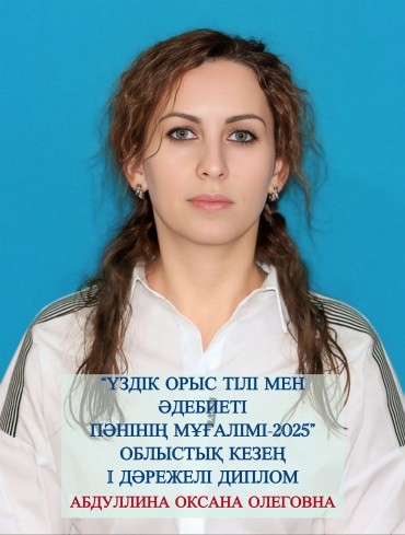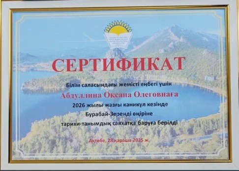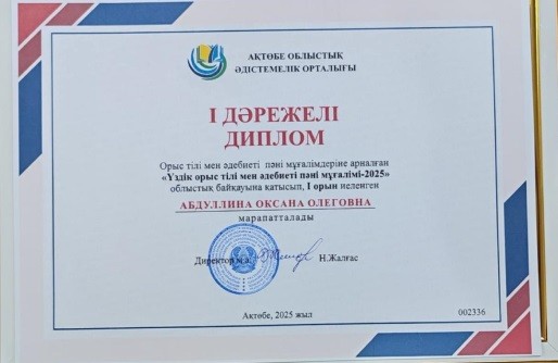 2025 жылдың 28 қарашасы күні “ҮЗДІК ОРЫС ТІЛІ МЕН ӘДЕБИЕТІ ПӘНІНІҢ МҰҒАЛІМІ-2025” байқауының облыстық кезеңінде инновациялық педагогикалық тәжірибесімен бөлісіп, жоғары деңгейде кәсіби шеберлігін көрсеткен ОКСАНА ОЛЕГОВНА АБДУЛЛИНАНЫ құттықтаймыз!Қарғалы ауданының абыройын көтерген ОКСАНА ОЛЕГОВНА АБДУЛЛИНА I дәрежелі диплом және Бурабай-Зеренді өңіріне тарихи-танымдық саяхатқа жолдамамен марапатталды!