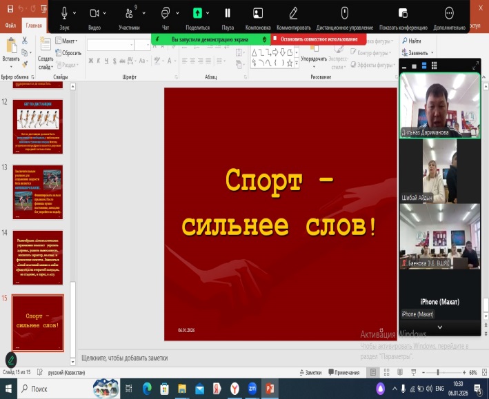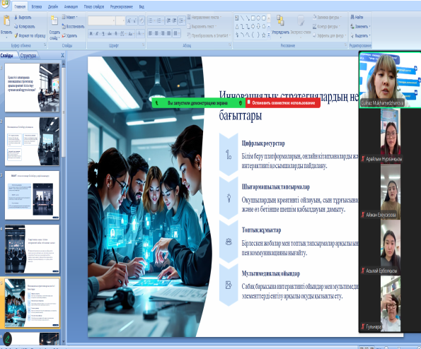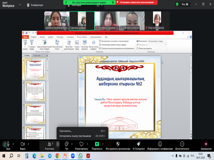 Бадамша мектеп-бөбекжай-бақшасының қазақ тілі мен әдебиеті пәні мұғалімі, Гулназ Нурлановна Мухамеджанова «Орыс мектептеріндегі қазақ тілі мен әдебиеті сабақтарында инновациялық стратегияларды меңгерту арқылы креативті білім беру ортасын құру»  атты аудан көлеміндегі шығармашылық шеберхананың екінші отырысын онлайн өткізді.