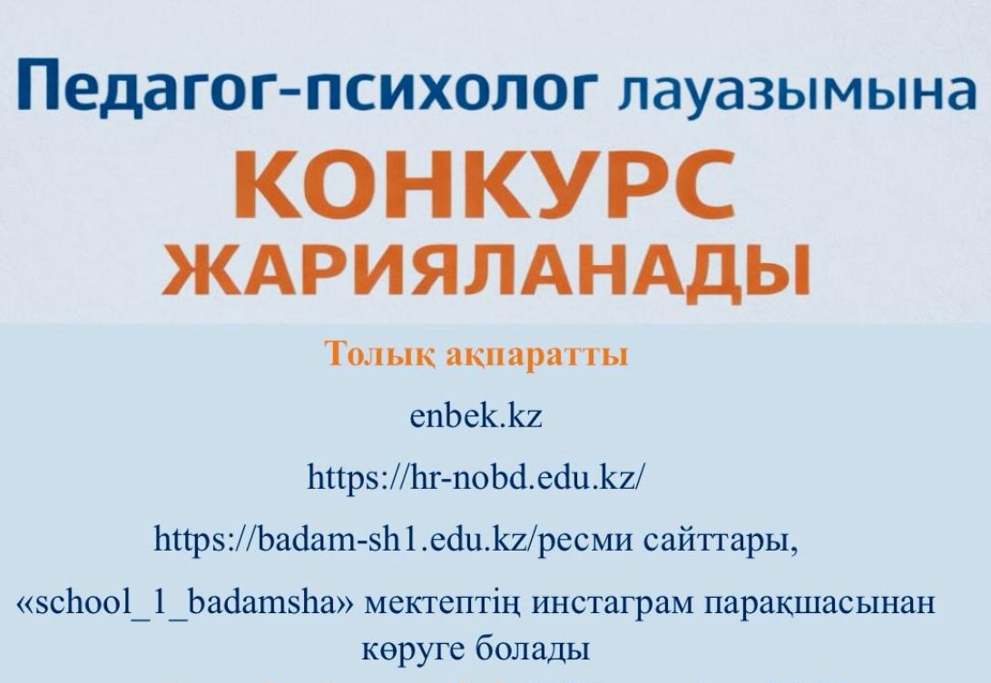 Мектептегі педагогтің бос лауазымы туралы ақпаратты жұмыспен қамту орталығының «enbek.kz» электрондық еңбек биржасы сайтында, мектептің http:// badam-sh1.edu.kz  ресми сайтында, мектептің инстаграм «school_1_badamsha» парақшасында көруге болады.