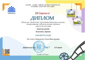 Балгазина Дарина – ІІІ место в областном конкурсе фото-видео «Жан Ұя-Life»!!!