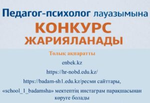 Педагог-психолог лауазымына конкурс (қазақ және орыс тілінде, 1 жүктеме, еңбекақы 180 мың тг) жариялайды